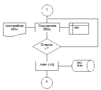 де M – кількість місяців експлуатації НМА. Структурно-логічна схема алгоритму Структурно-логічна схема алгоритму розв’язання задачі наведено на рисунку 4.3 Розв’язання задачі починається з вибору у головному меню відповідного режиму роботи: надходження нематеріального активу, списання нематеріального активу, обчислення норми амортизації нематеріального активу. При виборі режиму надходження нематеріального активу з первісного документу вводяться дані про нематеріальних актив – його код, назва, група, початкова вартість. Якщо помилок немає, то робиться запис у базу даних. При виборі режиму списання нематеріального активу з первісного документу вводяться дані про нематеріальних актив – його код, назва, група, вартість реалізації нематеріального активу. Якщо помилок немає, то робиться запис у базу даних. При виборі режиму обчислення амортизації нематеріального активу на екран виводиться нематеріальний актив, що є у базі, для нього вводиться термін амортизації, обирається метод розрахунку амортизації і виконується розрахунок. Інформація автоматично записується у БД. Після обрахунку амортизації користувач може вивести на друк звіт про обраховану амортизацію нематеріального активу.