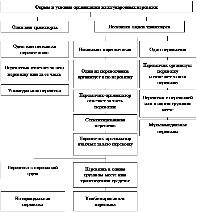 (смешенные, модальные, интермодальные) Унимодальная (юнимодальная) перевозка - это перевозка грузов одним видом транспорта одним или несколькими перевозчиками. Интермодальная перевозка - это перевозка несколькими видами транспорта с перевалкой грузов, при этом один из перевозчиков организует всю перевозку от одного пункта происхождения через один или несколько пунктов перевалки до конечного пункта и в зависимости от распределения ответственности за перевозку выдает различные виды транспортных документов. Сегментированная перевозка возникает, если перевозчик, организующий транспортировку, принимает ответственность лишь за часть перевозки, осуществляемой им самим. При этом он может выписать документ на интермодальную или комбинированную перевозку. Мультимодальная перевозка возникает, если перевозчик, организующий транспортировку, принимает ответственность за всю перевозку с выдачей документа о мультимодальной перевозке. Комбинированная перевозка - это перевозка грузов в одном и том же грузовом месте или транспортном средстве последовательно различными видами транспорта с использованием сквозного документа. Смешанная перевозка - это перевозка, по крайней мере, двумя видами транспорта.
