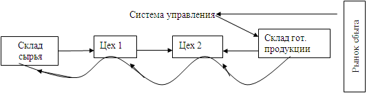 Принципиальная схема вытягивающей системы управления Здесь центральная система управления не вмешивается в обмен МП между различными участками предприятия, не устанавливает для них текущих производственных заданий. Производственная программа отдельного технологического звена определяется размером заказа последующего звена. Центральная система управления ставит задачу лишь перед конечным звеном производственной технологической цепи. На практике реализованы различные варианты толкающих и тянущих систем. К тянущим внутрипроизводственным ЛС относят: систему «Джаст ин тайм» — «точно в срок»; систему «Канбан». «Джаст ин тайм» — «точно в срок» — общий организационный подход, с помощью которого в результате учитывающего детали спроса, точного управления резко сокращаются запасы и, тем самым, длительность производственного цикла. «Канбан» (карточка) — метод (информационная система), разработанный в Японии в рамках подхода «Джаст ин тайм», обеспечивающий оперативное регулирование количества произведенной продукции на каждой стадии поточного производства. Средством передачи информации о потребностях и заказе является карточка КАNВАN, которая реализована на бумажном или информационном носителе. Существуют два вида карточек: карточка отбора (транспортная и карточка производственного заказа). В транспортной карточке сообщается информация о виде и количестве деталей, которые необходимо забрать из накопителя и доставить к месту потребления; в карточках производственного заказа фиксируются наименование и количество детали которые должны быть изготовлены на предшествующем рабочем участке. Работа механизма «вытягивания» может быть представлена следующим образом. Допустим, предприятие получило заказ на изготовление 10 единиц продукции. Этот заказ система управления передает в цех сборки. Цех сборки для выполнения заказа запрашивает 10 деталей из цеха № 1. Передав из своего запаса 10 деталей, цех № 1 с целью восполнения запаса заказывает у цеха № 2 десять заготовок. В свою очередь цех № 2, передав 10 заготовок, заказывает на складе сырья материалы для изготовления переданного количества, также с целью восстановления запаса. Таким образом, МП «вытягивается» каждым последующим звеном. Причем персонал отдельного цеха в состоянии учесть гораздо больше специфических факторов, определяющих размер оптимального заказа, чем это смогла бы сделать центральная система управления.