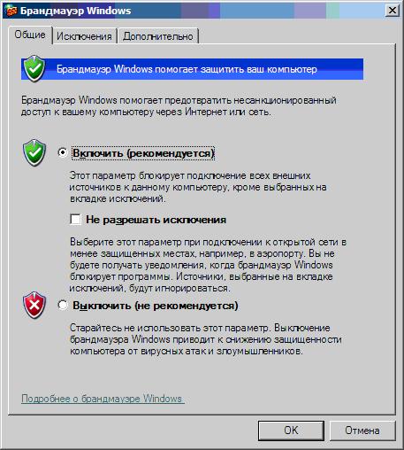Рис. 5.1. Настройки автоматического обновления Windows XP C помощью этого компонента можно автоматически загружать исправления для операционной системы Windows XP, а также для Internet Explorer, Outlook Express и некоторые исправления для Microsoft Office по мере их появления. В качестве альтернативы компоненту Автоматическое обновление можно использовать специальную программу - Microsoft Baseline Security Analyzer, доступную для бесплатной загрузки на сайте Microsoft. Эта программа может использоваться не только на Windows XP, но и на других операционных системах Microsoft Windows семейства NT. Кроме проверки, все ли выпущенные исправления установлены, программа также обнаруживает слабые места в настройках операционной системы, такие как пустые или слабые пароли, открытые на запись папки общего доступа и др. Подобные слабые настройки также могут использоваться вирусами для распространения, в частности через папки общего доступа по локальной сети. В последнее время вредоносные программы, использующие уязвимости в Windows и прикладных программах, появляются все быстрее и быстрее после выхода исправлений к этим уязвимостям. В некоторых случаях вредоносные программы появляются даже раньше исправлений. Помня об этом, необходимо своевременно устанавливать исправления и лучше всего для этого использовать средства автоматической установки, описанные выше. Хотя большинство вредоносных программ используют уязвимости в продуктах Microsoft, существует немало и таких, которые эксплуатируют дыры в программах других производителей. Особенно это касается широко распространенных программ обмена сообщениями, браузеров и почтовых клиентов. Поэтому мало просто установить браузер, отличный от Internet Explorer, его тоже нужно обновлять по мере выхода исправления. Чаще всего, в подобных программах есть встроенные средства обновления, но для подстраховки нелишним будет следить за новостями на веб-сайтах, посвященных вопросам безопасности. Информация обо всех критических уязвимостях и исправлениях к ним обязательно попадает в новостную ленту. Брандмауэры Для того чтобы удаленно воспользоваться уязвимостью в программном обеспечении или операционной системе, нужно установить соединение и передать специально сформированный пакет данных. Следовательно можно защититься от таких попыток проникновения и заражения, путем запрета определенных соединений. Задачу контроля соединений успешно решают программы-брандмауэры. Брандмауэр - это программа, которая следит за сетевыми соединениями и принимает решение о разрешении или запрещении новых соединений на основании заданного набора правил. Правило брандмауэра как правило задается несколькими атрибутами: · Приложение - определяет программу к которой относится правило, так что одни и те же действия могут быть разрешены одним программам и запрещены другим. Например, получать и отправлять почту разумно разрешить только программе - почтовому клиенту · Протокол - определяет протокол, используемый для передачи данных. Обычно можно выбрать между двумя протоколами TCP и UDP 1UDP - User Datagram Protocol, протокол используемый для передачи данных без подтверждения доставки, используется, например, в таких службах как DNS - службе разрешения имен в Интернет, которая сопоставляет символьные адреса и IP-адреса. Поскольку UDP не гарантирует доставку данных, он является более быстрым, но ме