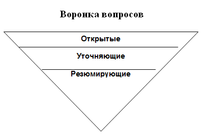 Помимо того, что на начальных этапах взаимодействия следует задавать открытые вопросы, следует помнить еще об одной технике – так называемой воронке вопросов.