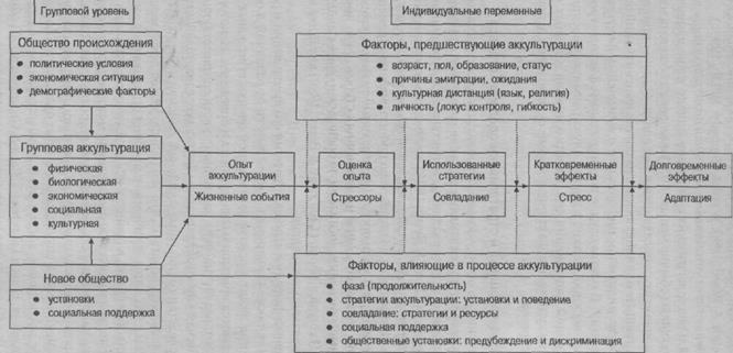 Модель стрессам его преодоления, усовершенствованная и дополненная Берри (Berry, 1997) в его последнем обзоре, касающемся иммиграции, аккультурации и адаптации, выдвигает на передний план жизненные изменения, которые влечет за собой кросс-культурное перемещение, оценку этих изменений и выбор и реализацию стратегии, позволяющую справиться с возникающими при этом проблемами (рис. 20.2). На эти Процессы, как и на их психологические последствия, оказывают влияние различные факторы, действующие как на групповом, так и на личностном уровне. На макроуровне важны как характеристики общества, в котором проживает индивид, так и характеристики общества происхождения. Отличительные особенности этих обществ могут включать социальные, политические и демографические факторы, такие как этнический состав общества, уровень культурного плюрализма и отношение к этническим и культурным они-группам. На микроуровне на стресс, его преодоление и адаптацию влияют характеристики индивида, который усваивает новую культуру, и условия, в которых происходит это усвоение. Кроме того, Берри различает факторы, которые действуют перед началом и в процессе аккультурации. В первом случае могут иметь значение такие факторы, как личностные особенности и культурная дистанция, во втором более важными становятся стратегия усвоения новой культуры или социальная поддержка. Специалисты по кросс-культурным исследованиям, изучавшие процесс аккультурации с точки зрения стресса и его преодоления, интересовались прежде всего перспективами психологической адаптации. Многие стали рассматривать факторы, которые обычно учитываются при исследованиях стресса и его преодолении, а именно: жизненные изменения, когнитивную оценку стресса, подходы к преодолению стресса, личностные факторы и социальную поддержку. Другие сосредоточились на переменных, специфических для кросс-культурного перемещения и адаптации, таких как культурная идентичность и тип группы, усваивающей новую культуру. И все же многие явно попытались найти связи между тремя важнейшими теоретическими подходами к аккультурации и стали рассматривать такие переменные, как ощущение дискриминации, социально-культурная адаптация и стратегии усвоения новой культуры как прогностические факторы или корреляты психологической адаптации. Эти факторы рассматриваются ниже. Перспективы психологической адаптации Жизненные изменения Подход к аккультурации с точки зрения стресса и его преодоления рассматривает последствия кросс-культурного перемещения как ряд стрессовых жизненных изменений, требующих мобилизации адаптивных ресурсов и обязательной ответной реакции. Следовательно, важной особенностью этого подхода является оценка значимых для жизни событий (Holmes & Rahe, 1967). Масуда с соавторами (Masuda, Lin & Tazuma, 1982) изучали вьетнамских беженцев в США сразу по прибытии и год спустя. Авторы говорят о том, что между жизненными изменениями и психологическим и психосоматическим недомоганием наблюдалась заметная связь в первом и во втором случае (0,27 и 0,15 соответственно). Корреляция подобного