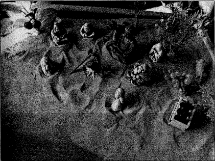 Сочетание неба и солнца, — эти два цвета сами по себе оказывают благотворительное воздействие. Погружаясь в песок, руки оказываются в голубом и желтом цвете. Один цвет холодный, другой — теплый. Их сочетание дает космическое ощущение гармонии и торжество содружества. Одно сменяется другим. Из хаоса возникает порядок и наоборот. Из тьмы выходит свет, из земли — дерево. Солнце, вода и земля приносят плоды совместными усилиями. Эти великие компоненты зашифрованы в песочном поле. Солнце, вода и земля уничтожают и поглощают все живое, и они же всему дают рождение. Мы — заложники великой формулы жизни. Цветовое впечатление от композиции также дает дополнительную информацию о психологическом и физическом состоянии человека на данном этапе. Композиции могут быть блеклыми, серыми и могут быть насыщенными, цветными. О цветовых взаимоотношениях можно прочитать в исследованиях Макса Люшера. Можно посмотреть на цветовой круг, которым пользуются художники, обратиться к исследованиям цвета Гете. Конечно, люди выбирают цвет в соответствии со своим состоянием. Если много оранжевого цвета — значит, у человека низкое давление. На подсознании он поддерживает себя цветом. Красно-зеленые тона показывают активный контраст. Разноплановый человек выберет все цвета радуги. Белый цвет включает в себя все цвета и со всеми сочетается. Хаотические цвета говорят о таком же состоянии в душе. Гармоничное сочетание раскрывает гармоничные возможности человека. Если какой-то цвет выбивается из общего соответствия, можно получить дополнительную информацию, осознав, почему цвет находится в противодействии с общим тоном. Отсутствие цвета, серость также сообщает о соответствующем состоянии человека в данное время. На картине может отсутствовать какой-то один цвет, то есть человек его игнорирует, и это тоже дополняет информацию о состоянии человека. Возможно, человек какой-то цвет вообще не любит и относится к нему с пренебрежением или отрицанием. Посмотрите, что он отрицает, исключая цвет из своего сознания. В подсознании это цвет, конечно, будет присутствовать. Показатель- Часть шестая ным примером является работа женщины, которая, обратив внимание на оранжевые цветы, спросила: «Неужели кто-то берет такое дикое сочетание цвета?» И через некоторое время взяла то, что она отвергала, и отвергнутым оказалось то, чего ей хотелось: «чего-то весеннего, веселого». Цветная радость ожидания. До этого цветовая гамма ее композиции была коричнево-серой со спрятанным в «тон-нельке» ярко-красным колокольчиком. Цветовые предпочтения человека глубоко исследованы и описаны в работах Макса Люшера, к которым мы вас и отсылаем. Владея цветовой кодировкой психосостояний, можно видеть, чтб в данный момент беспокоит человека. Символике цвета особенно сильное значение придавалось в эпоху Возрождения. По цвету можно было определить принадлежность к сословию, к профессии, душевное состояние, например, черные траурные одежды говорили о том, что у человека горе. Одежду зеленого цвета полагалось носить во время ожидания ребенка, комната для новорожденного также готовилась в зеленых тонах. Сочетание голубых, красных и золотых цветов свидетельствовало о святости. Одежду пурпурного цвета могли надевать только приближенные к богам императоры. В нашу унифицированную эпоху, когда л