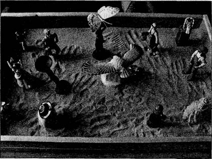 На этой фотографии — результат перестроенной композиции, где мы отчетливо видим отпечатанные ладони. Эти отпечатки говорят о начале нового осознания себя как личности. Изначально на поле в разумной части стояла рыба. Это печать предыдущих мучительных размышлений. В левой части внизу транспорт — паровоз с часами и самолет с обломанным крылом. В правой части внизу тоже транспорт — мотороллер. В верхнем углу высокая башня, маленький розо-венький домик и фонарь. В правой части вверху — эльф, сидящий на постаменте. В центре — новгородский храм и негритянка, которая держит над головой поднос с бабочкой. Негритянку обрамляет круг из небольших предметов: свеча, стеклянные сердечки. Картина абсолютно равновесная. Из тех, в которую постороннему не войти. После однообразных объяснений, что означает каждая фигурка (де- Состояние вушка говорила: «Взяла, потому что нравится»), мы спросили: «Почему между ней и сегодняшним днем проложена граница из сердечек?» Она не знала. Созерцание длилось долго. «Почему в центре стоит храм?» — «Когда мне плохо, я хочу уйти в монастырь». Перестраивать ничего не хотелось. Когда мы говорили значение какого-нибудь символа, девушка отвечала: «Да, так оно и есть». Но менять ничего не хотела. В сегодняшнем дне пустота. «Да, так и есть». Лампа сигнализирует о темноте, о том, что что-то хочется осветить, чего не видно. «Да, я не вижу, что мне делать». Транспорт означает желание изменить ситуацию, не прилагая усилий. «Да. Так оно и есть». Моя коллега настаивала попробовать что-нибудь изменить, я настаивала, что ничего менять не надо, раз не хочется, не надо даже пробовать. Девушка словно была в ступоре. «Я все понимаю, — говорила она, — но менять ничего не хочу». Наполнившись безысходностью, наслушавшись себя, своего нежелания что-нибудь менять, она все же убрала границу между собой и сегодняшним днем. Сделав один шаг, ей захотелось сделать второй. Решительно встряхнувшись, она убрала рыбу без воды, и поставила в центр то, что мы видим на фотографии. В дальнейшем мы решили сознательно применять этот прием, когда один из нас предлагает менять композицию, а другой убеждает даже не пытаться это сделать. Мы обратили внимание на многоэтажность в символах девушки. «Наверху, — сказала она, — божественное, духовное. Внизу — жизненное, чувственное». Мы предложили еще что-нибудь переделать. «Захотелось людей», — сказала она. И наполнила песочное поле разными людьми. «Это значит, что я могу общаться с разными людьми. Картина называется „Вместе". Это в углу— монах». «Смею заметить, что это не монах». —«Ктожеэто? — берет в руки фигурку и рассматривает ее. — Женщина? Лучник? Убийца львов? Астронавт? Явно бдит, смотрит. Не таится ли там опасность. Атеперь он смотрит на звезды. Там тайны, которые скрываются. Заботливый. Пальцами не указывает». — Возможно, когда ты хотела уйти в монастырь, ты хотела чего-то другого, принимая за монаха, того, кто на самом деле монахом не был. А что это за фигурка, которая смотрит в другую сторону от остальных? Все смотрят в центр, а он вправо». — «Это китайский мудрец. Хотя, нет, теперь я вижу, что это монгольский певец. Это мое желание петь». Она посмотрела на композицию и сама себя спросила: «Куда это они направляются? — и сама себе ответила. — Сюда. Здесь интересно». — «Что тебе нравится в твоем поле?» — «Заполненность