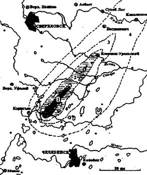 как 10–4-10–5 в год. Тем не менее, атомной энергетике часто приписывается наивысшая экологическая опасность, что обусловлено, прежде всего, чрезвычайными авариями, имевшими место в СССР. Поучительным и трагическим примером такой аварии считается авария на ПО «Маяк». ПО «Маяк». Самое крупное из известных сейчас скоплений радионуклидов находится на Урале, в 65 км к северо-западу от Челябинска на территории ПО «Маяк», созданного на базе промышленного комплекса, построенного в 1945—1949 гг. в Челябинской области, в районе городов Кыштым и Касли. Здесь в 1948 г. был пущен первый в стране промышленный атомный реактор, в 1949 г. — первый радиохимический завод, изготовлены первые образцы атомного оружия. В настоящее время в производственную структуру ПО «Маяк» входят ряд производств ядерного цикла, комплекс по захоронению высокоактивных материалов, хранилища и могильники РАО. Многолетняя деятельность ПО «Маяк» привела к накоплению огромного количества радионуклидов и сильному загрязнению районов Челябинской, Свердловской, Курганской и Тюменской областей. В результате сброса отходов радиохимического производства непосредственно в открытую речную систему Обского бассейна через р. Теча (1949—1951 гг.), а также вследствие аварий 1957 и 1967 гг. в окружающую среду было выброшено 23 млн. Ки[4] активности. Радиоактивное загрязнение охватило территорию в 25 тыс.км2 с населением более 500 тыс. человек. Официальные данные о десятках поселков и деревень, подвергшихся загрязнению в результате сбросов радиоактивных отходов в р. Теча, появились только в 1993 г. В 1957 г. в результате теплового взрыва емкости с РАО произошел мощный выброс радионуклидов (церий-144, цирконий-95, стронций-90, цезий-137 и др.) с суммарной активностью 2 млн. Ки. Возник «уральский радиоактивный след» длиной до 110 км (в результате последующей миграции даже до 400 км) и шириной до 35—50 км (рис. 1.1., [9]). Общая площадь загрязненной территории, ограниченной изолинией 0,1 Ки/км2 по стронцию-90, составила 23 тыс. км2. Около 10 тыс. человек из 19 населенных пунктов в зоне наиболее сильного загрязнения с большой задержкой были эвакуированы и переселены. Зона радиационного загрязнения на Южном Урале расширилась вследствие ветрового разноса радиоактивных аэрозолей с пересохшей части технологического водоема № 9 ПО «Маяк» (оз. Карачай) в 1967 г. В настоящее время в этом резервуаре находится около 120 млн. Ки активности, преимущественно за счет стронция-90 и цезия-137. Под озером сформировалась линза загрязненных подземных вод объемом около