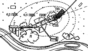 Экологические нормативы соизмерения. В § 2.1. в качестве основного условия экологической безопасноси территориальных комплексов было названо главное условие соизмерения: техногенная нагрузка на территорию не должна превышать экологическую техноемкость территории. Экономический рост, превышающий порог допустимых нагрузок, выступает как основной дестабилизирующий фактор для окружающей среды. Именно поэтому соизмерение и согласование экономических и природных потенциалов и формирование эколого-экономической системы должны быть предметом экономической теории и практики. Сама по себе процедура соизмерения основана на определении и сопоставлении экологической техноемкости территории (ЭТТ или ПДТН) и природоемкости хозяйства территории. Эта процедура практически совпадет с оценкой безопасности территориальных комплексов. Экологическая техноемкость территории и предельно допустимая техногенная нагрузка по существу являются фундаментальными экологическими нормативами, предназначенными для регламентации территориальной хозяйственной деятельности. Но именно ЭТТ и ПДТН законодательно не утверждены как нормативы. Санитарно-гигиенические нормативы как критерии соизмерения. Вся сфера экологического нормирования и стандартизации, особенно связанная с техногенным загрязнением среды, так или иначе опирается на гигиенические нормы и использует установленные предельно допустимые концентрации (ПДК) или предельно допустимые дозы (ПДД) вредных агентов. ПДК — это та наибольшая концентрация вещества в среде и источниках биологического потребления (воздухе, воде, почве, пище), которая при более или менее длительном действии на организм (контакте, вдыхании, приеме внутрь) не оказывает влияния на здоровье и не вызывает отставленных эффектов (не сказывается на потомстве и т.п.). Поскольку возможный эффект зависит от длительности действия, особенностей обстановки, чувствительности реципиентов и других обстоятельств, различают ПДК среднесуточные (ПДКсс), максимальные разовые (ПДКмр), ПДК рабочих зон (ПДКр3), ПДК для растений, животных и человека. В настоящее время установлены ПДК нескольких тысяч индивидуальных веществ в разных средах и для разных реципиентов. ПДК не являются международным стандартом и могут несколько различаться в разных странах, что зависит от методов определения и спецификации. На основании величин ПДК с помощью специальных алгоритмов (см., например, 2) и программ вычисляются значения предельно допустимых эмиссий — предельно допустимые выбросы в атмосферу (ПДВ), предельно допустимые сбросы в водоемы (ПДС) тех или иных веществ, выделяемых конкретными источниками (предприятиями) данной территории. При этом учитываются характеристики источников и условия распространения эмиссий. Например, для того чтобы в ближайшем к заводским трубам жилом квартале города при наименее благоприятных условиях рассеяния не превышались ПДК определенных аэрополлютантов, нужно ограничить выброс этих веществ постоянной предельной величиной — ПДВ. Подобная ситуация схематически отображена на рис. 2.3. ПДВ и ПДС уже непосредственно регламентируют интенсивность и качество технологических процессов, являющихся источником загрязнения, и приобретают свойство экологических нормативов. Сверхнормативные эмиссии влекут за 