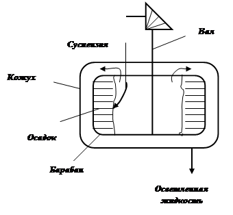 Рис. 4.8. Схема устройства циклона: Рис. 4. 9 Схема отстойной центри- 1 – корпус; 2 – коническое днище. фуги периодического действия с ручной выгрузкой осадка. Отстойное центрифугирование применяется преимущественно для разделения суспензий и эмульсий во вращающихся аппаратах, называемых отстойными центрифугами. Процесс осаждения в центрифугах характеризуется теми же законами, что и осаждение в циклонах, а следовательно и все приведенные выше формулы справедливы и для них. Центрифуги различают по принципу действия (периодические, непрерывные); по способу выгрузки материала (с ручной и механизированной выгрузкой) и по расположению вала (вертикальные, горизонтальные, наклонные). Схема простейшей отстойной центрифуги с вертикальным расположением вала показана на рис.4.9. Центрифуга рассчитана на ручную выгрузку осадка. Основные части этой центрифуги – сплошной барабан 2, насаженный на вращающийся вал 1, и кожух 3. Под действием центробежной силы твердые частицы осаждаются из суспензии, подаваемой в центрифугу, и отлагаются в виде сплошного осадка на стенке барабана; осветленная жидкость переливается в кожух и удаляется из него через расположенный внизу патрубок. По окончании отстаивания центрифугу останавливают и выгружают осадок вручную.