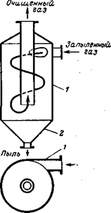 т.е. центробежная сила больше силы тяжести в w2r/g×r раз. В производственных процессах соотношение между wr и r таково, что центробежная сила не меньше, чем на два порядка превышает силу тяжести. Циклонный процесс используется преимущественно для разделения пылей, однако находит свое применение и для разделения суспензий (гидроциклоны). Сущность циклонного процесса заключается в том, что поток, несущий взвешенные частицы, вводят в аппарат тангенциально через входную трубу (рис. 4.8) с рассчитанной скоростью 10 – 40 м/сек. В случае газов и 5 – 25 м/сек в случае жидкостей. Благодаря тангенциальному вводу и наличию центральной выводной трубы поток начинает вращаться вокруг последней, совершая при прохождении через аппарат несколько оборотов. Под действием возникающих центробежных сил взвешенные частицы отбрасываются к периферии, оседают на внутренней поверхности корпуса 1, а затем опускаются в коническое днище 2 и удаляются из аппарата через патрубок. Освобожденный от взвешенных частиц поток выводится из циклона через выводную трубу.