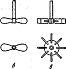Перемешивание в жидкой среде – создание необходимого поля скоростей потоков жидкости в аппаратуре путем сообщения жидкости определенной энергии. Применяется для получения эмульсий и суспензий, а также для интенсификации тепловых, диффузионных и химических (биохимических) процессов. Преимущественное значение в химической и нефтехимической промышленности имеет механическое перемешивание. Интенсивность перемешивания определяется количеством энергии, вводимой в единицу объема перемешиваемой среды в единицу времени. Интенсивность перемешивания обуславливает характер движения данной жидкости в аппарате. Механическое перемешивание осуществляется при помощи мешалок различного типа. Мешалка чаще всего представляет собой ту или иную комбинацию лопастей, насаженных на вращающийся вал. Различают лопастные, пропеллерные и турбинные мешалки. На рис. 4.15 показаны наиболее распространенные пропеллерные и турбинные мешалки.