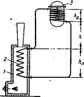 НАГРЕВАНИЕ ПРОМЕЖУТОЧНЫМИ ТЕПЛОНОСИТЕЛЯМИ При нагревании многих материалов для сохранения качества продуктов или обеспечения безопасной работы недопустим даже кратковременный их перегрев. В этих случаях для обогрева применяют промежуточные теплоносители, которые сначала нагреваются топочными газами, а затем передают воспринятое тепло обрабатываемым материалам. В качестве промежуточных теплоносителей применяют минеральные масла, перегретую воду, высокотемпературные органические теплоносители, расплавленные смеси солей и др. Нагревание топочными газами через жидкостную баню относится к простейшим способам нагревания промежуточными теплоносителями. В этом случае аппарат снабжают рубашкой, заполненной, например, маслом. Топочные газы омывают рубашку и передают тепло маслу, а масло через стенки аппарата — обрабатываемым материалам. Для повышения эффективности нагревания используют установки с циркулирующим жидким промежуточным теплоносителем. Принципиальная схема такой установки показана на рис. 4.21 Жидкий теплоноситель нагревается в змеевике 2 печи 1. В результате уменьшения при нагревании удельного веса теплоносителя он перемещается по трубопроводу вверх к обогреваемому аппарату 3. Теплоноситель проходит по змеевику, расположенному вокруг этого аппарата, и отдает тепло нагреваемому материалу.