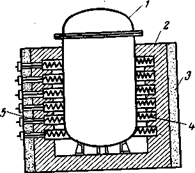 Электрические индукционные печи (рис. 4. 23). Нагревание в этих печах осуществляется индукционными токами. Обогреваемый аппарат 1 является сердечником соленоида 2, охватывающего аппарат; по соленоиду пропускается переменный ток, при этом вокруг соленоида возникает переменное магнитное поле, которое индуцирует в стенках обогреваемого аппарата электродвижущую силу. Под действием возникающего вторичного тока нагреваются стенки аппарата.