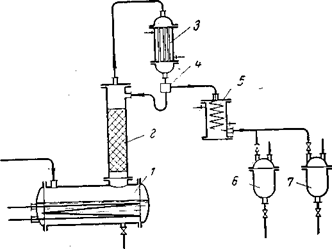 Установка непрерывного действия для разделения исходной смеси на две составляющие части приведена на рис. 4.32. Исходная смесь поступает в подогреватель 1, где ее температура повышается за счет тепла греющего водяного пара до температуры