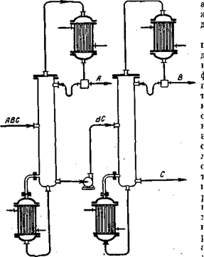 кипения. Нагретая смесь поступает в питающую секцию ректификационной колонны 2, присоединяясь к орошению, которое обеспечивается конденсацией паров в дефлегматоре 3. Необходимое для проведения ректификации многокомпонентное испарение жидкости осуществляется в кипятильнике 4. В дефлегматоре 3 происходит полная конденсация паров. Из делителя потока часть дистиллята, отвечающая флегме, возвращается в колонну, а остальная часть проходит через холодильник 5 и направляется в сборник 7. Менее летучая часть исходной смеси непрерывно отбирается из нижней части ректификационного аппарата и поступает в сборник 6. В рассмотренной схеме не учитывается возможность рационального использования тепла. Практически тепло отходящих потоков можно использовать для нагревания входящих и, в частности, нагревать исходную смесь за счет тепла жидкости, удаляющейся из нижней части колонны. Ректификация многокомпонентных смесей непрерывным методом осуществляется в аппаратурных агрегатах, построенных по типу многоколонных схем (рис. 4.33). Если исходная смесь должна быть разделена на три части А, В и С, то одна колонна может обеспечить разделение либо на А + ВС, либо на АВ + С; для последующего разделения АВ или ВС необходима вторая колонна. Следовательно, для разделения исходной смеси на п частей необходим ректификационный агрегат, состоящий из n — 1 ректификационных аппаратов.