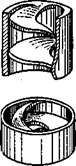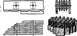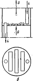 АБСОРБЦИОННАЯ И РЕКТИФИКАЦИОННАЯ АППАРАТУРА Аппараты, предназначенные для проведения процессов абсорбции и ректификации, называются соответственно абсорберами или ректификационными колоннами. Указанные аппараты можно подразделить на три основные группы: - а) аппараты, в которых поверхностью фазового контакта является поверхность жидкости, растекающейся по специальной насадке; - б) аппараты, в которых поверхность фазового контакта создается потоками газа (пара) и жидкости; - в) аппараты, в которых поверхность фазового контакта создается вследствие разбрызгивания жидкости. Аппараты, в которых поверхностью фазового контакта является поверхность жидкости, растекающейся по насадке. К аппаратам указанного типа относятся пленочные аппараты и аппараты со смоченной насадкой. Пленочные аппараты выполняются преимущественно в виде трубчатых теплообменников и аппаратов с листовой насадкой. Взаимодействующая с газом (паром) жидкость поступает в верхнюю часть аппарата на трубную решетку, равномерно распределяется по трубам и в виде тонкой пленки и стекает по их внутренней поверхности. Газ (пар) поступает в нижнюю часть аппарата и движется навстречу жидкости. Аппараты со смоченной насадкой или просто насадочные колонны выполняются в виде цилиндрической колонны, заполненной насадочными телами. Насадка, или насад очные тела, могут иметь самую разнообразную форму. Практическое значение имеют хордовая насадка, кольца, фасонные насад очные тела, спиральная и сетчатая металлическая насадка, а также дробленый кусковой материал. Хордовая насадка (рис. 4.34), как правило, делается из деревянных брусьев, располагающихся правильными рядами друг над другом. Кольцевая насадка (рис. 4.35) состоит из керамических или стальных цилиндров, загружаемых в аппарат либо правильными рядами, либо навалом. Фасонная насадка (рис. 4.36) выполняется из керамики в виде седел, цилиндров с перегородками, пропеллеров и т. д., загружаемых в аппарат навалом.