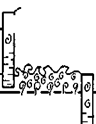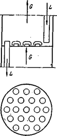 Рис. 4.37. Тарельчатая колонна с неорганизованным переливом жидкости. Суммарную площадь всех отверстий (щелей), или так называемое свободное сечение тарелок, подбирают так, чтобы при заданной скорости газового (парового) потока через часть отверстий происходило «проваливание» жидкости. Тарельчатые колонны с переливными устройствами. Эти аппараты (рис. 4.38) имеют горизонтальные тарелки 1 и переливные устройства 2. Жидкость поступает на верхнюю тарелку, переливается через переливные устройства сверху вниз и удаляется из нижней части аппарата. Газ (пар) вводится в нижнюю часть аппарата и перемещается вверх, распределяясь на каждой тарелке в виде пузырьков или факелов. В зависимости от способа распределения газа (пара) на тарелках различают тарелки ситчатые (рис.4.39) и колпачковые (рис.4.40). Характер распределения газа и жидкости зависит не столько от конструкции распределяющих устройств, сколько от скорости газового потока. При небольшой скорости газа в отверстиях ситчатой тарелки отдельные пузырьки газа (пара) отрываются и перемещаются в жидкости один за другим; при этом тарелка работает неполным сечением. Такой режим распределения газа называется пузырьковым. В интервале скоростей газового потока, соответствующих пузырьковому режиму, отмечаются граница скорости, при которой часть жидкости «проваливается»через отдельные отверстия, граница скорости, при которой «провал» отсутствует, но отверстия работают неравномерно, и, наконец, граница скорости, ответствующая равномерной работе тарелки во сем сечении. При этом на тарелке образуется ячеистая пена. При увеличении скорости газа происходит разрушение ячеистой пены; подобное распределение газа или пара называется факельным. При сильном возрастании скорости газа (пара) потоки его разбивают пену и начинают подбрасывать жидкость на большую высоту.