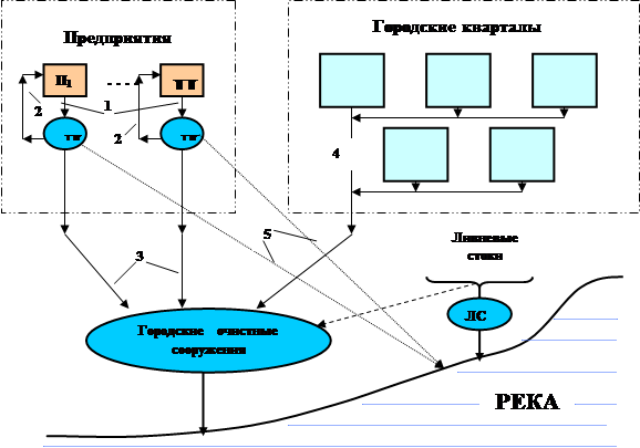 Рис. 2.1. Принципиальная схема очистки городских сточных вод. Обозначения: Л – локальные очистные сооружения; ЛС – городские сооружения для очистки ливневых стоков; 1 -сточные воды промышленного предприятия; 2 – очищенные сточные воды для повторного использования; 3 – сточные воды промышленного предприятия после локальнойочистки; 4 – хозяйственно-бытовые сточные воды; 5 – сточные воды промышленного предприятия после локальнойочистки с биологической доочисткой; 6 – ливневые сточные воды. ПРОМЫШЛЕННЫЕ СТОЧНЫЕ ВОДЫ Сточные воды любого промышленного предприятия (потоки 1 на рис. 2.1) содержат специфические загрязнения, которые должны удаляться (нейтрализоваться) до смешения со стоками другого производства или населенного пункта системами обязательной локальной очистки. Для очистки промышленных СВ используются механические, физико-химические, химические биохимические и термические методы [3]. В основе биохимических методов очистки сточных вод лежит способность микроорганизмов разрушать органические и некоторые неорганические соединения (сульфиды, серу, соли аммония и др.), превращая их в безвредные продукты окисления: воду, двуокись углерода, нитрат- и сульфат- ионы и др. Очищенные биохимическим способом сточные воды отвечают санитарно-гигиеническим требованиям и рыбохозяйственным нормативам, и их можно пускать в водоемы (потоки 5 на рис. 2.1), а также использовать в оборотном водоснабжении (потоки 2 на рис. 2.1). Целесообразна биохимическая очистка производственных СВ совместно с хозяйственно бытовыми водами, так как последние приносят азотистые вещества, необходимые для питания и размножения микроорганизмов (потоки 3 на рис. 1). Методы биохимической очистки сточных вод наиболее опасных с экологической точки зрения химических предприятий подробно изложены в монографии Н.Г. Ковалевой и В.Г. Ковалева [4]. Следует обратить внимание на успешные попытки биологической очистки хромсодержащих сточных вод [5], вод, содержащих хлорированные углеводороды [6] и др. Биохимическая очистка является завершающей стадией очистки сточных вод химических и нефтехимических предприятий. Микроорганизмы – деструкторы нефти известны давно и выделены из различных сред: пресных и морских вод, донных загрязнений, пластовых вод нефтяных месторождений, загрязненных нефтью почв и других. При благоприятных условиях среды (оптимальная температура, соленость, рН, достаточная степень аэрации, обеспеченность элементами минерального питания) удачно подобранная культура или смесь штаммов способны за короткое время практически полностью обезвредить десятки тонн нефтяных углеводородов (в качестве источника углерода и энергии), трансформировав их, в частности, в органическое вещество собственной биомассы, углекислый газ и безвредные для окружающей среды продукты. В монографии Минигазимова Н.С. и др. «Утилизация и обезвреживание нефтесодержащих отходов» [7] отмечается, что после максимального извлечения полезных компонентов из нефтесодержащих отходов, оставшийся донный шлам и загрязненные участки грунта должны подвергаться обезвреживанию, завершающей стадией которого является биологическая обработка, позволяющая снизить содержание нефти до фоновых значений. В США метод биологической обработки нефтесодержащих осадков (ландфарминг) применяется уже