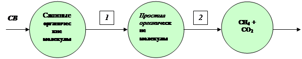 Рис. 2.3. Основные стадии анаэробной очистки СВ (1 – кислотоообразующие бактерии; 2 – метанообразующие бактерии)