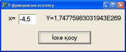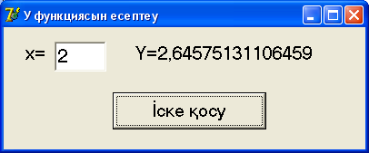 3. Формада Button1 батырмасын екі рет шертіп, оның onClick оқиғасының өңдеуіш процедурасын құру 4. Құрылған процедураға қарастырып отырған мысалымыздың программасын төмендегідей етіп жазамыз: procedure TForm1.Button1Click(Sender: TObject); var x,y:real; Begin x:=StrToFloat(Edit1.Text); if x>2 then y:=sin(x)-1/2*sqrt(sqr(x)+3); Label2.Caption:='Y='+FloatToStr(Y); if x<2 then y:=x*sin(x)-1/2*sqrt(sqr(x)+3) else begin y:=sqrt(sqr(x)+3); Label2.Caption:='Y='+FloatToStr(Y); end; end; End. 5. Жобаны сақтап, іске қосу командасын беру. 6. Программаны компиляциялау командасын беру (F9) немесе Run; Программа компиляцияланып шыққан соң, жүйе нүктесіз форманы экранға шығарады; 7. Курсорды Edit1 өрісіне орналастырып оған х –тің нақты кез келген мәнін енгізу; 8. Форманың “ Іске қосу ” батырмасын шерту. Label2 өрісіне функция нәтижесі жазылып қойылады (15.7-сурет).
