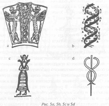 Адам — что согласуется и с библейской версией — действительно появился на свет один. Но после того как «модель» человека доказала свою жизнеспособность, был запущен проект массового воспроизводства «детей из пробирки». Приготовив дополнительное количество ТИ.ИТ — «то, что содержит жизнь», или библейская «глина», — подвергнувшееся генетическим манипуляциям с целью создания примитивного рабочего, Нинмах отложила четырнадцать ломтей «глины», семь направо и семь налево. Оплодотворенные яйцеклетки поместили в матки «богинь рожденья». В результате на свет появились семь мужских и семь женских особей «смешанного» существа — в полном соответствии с одной из версий Книги Бытия, утверждающей, что «...мужчину и женщину сотворил их». Однако, подобно любому гибриду (примером тому может служить мул, помесь лошади и осла), «смешанный» человек был бесплоден. Библейский рассказ о том, как человек получил «знание», или способность к размножению, в аллегорической форме описывает второй этап манипуляций с генами. Главным действующим лицом на этот раз выступают не Иегова-Элогим или Адам с Евой, а змей. Именно он становится инициатором важных биологических изменений. В оригинале Библии для обозначения «змея» используется слово Нахаш. Это слово имеет еще два значения: «тот, кто знает секреты» и «тот, кто знает медь». Последние два значения, по всей видимости, происходят от одного из шумерских эпитетов Энки, БУЗУР, что означает «тот, кто открывает секреты» и «тот, кто знает рудники». И действительно, символом Энки в Шумере считалась змея. В одной из предыдущих книг («Назад в будущее») мы высказали предположение, что в основу эмблемы из двух переплетенных змей (рис. 5а), сохранившейся до наших дней в виде эмблемы медицины, легла — в древнем Шумере! — структура двойной спирали ДНК (рис. 5б). Этот факт указывает на прямую связь с генной инженерией. Далее мы покажем, что генетические манипуляции Энки в Эдемском саду лежат в основе орнамента двойной спирали на изображениях древа жизни. Энки передал знания в области генетики и символ в виде переплетенных змей своему сыну Нингишзидду (рис. 5с), которого отождествляют с египетским богом Тотом; греки называют этого бога Гермесом, и его посох украшен эмблемой из переплетенных змей (рис. 5d).