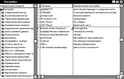 Общесистемная настройка позволяет задать параметры настройки, общие для всех пользователей, работающих с системой. Работая с модулем Настройка, следует выполнить команду меню Настройка \Настройка. Диалоговое окно =Настройка= показано на рис. 1.21. Прочитайте названия разделов в левой панели окна настроек. Вы узнаете о сферах управления типовым предприятием. В правой панели находятся параметры выделенного раздела. Разделы имеют вложенную структуру и могут иметь подразделы. Вложенность раскрывается по клавише Enter или двойным щелчком мыши. Разделы и подразделы могут иметь собственные параметры настройки.