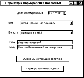 Под внутренним понимается перемещение МЦ между подразделениями нашего предприятия. Оформим сразу пакет накладных по передаче МЦ из нескольких складов в Магазин запчастей. Выполните пункт Операции \Пакетное формирование накладных на внутреннее перемещение. В окне =Параметры формирования= задайте 5 полей (рис. 7.2): · Дата формирования - ТД/ТМ/ТГ, · Вид - склад->розничная торговля, · Валюта - накладная в НДЕ, · Куда - Магазин запчастей, · Кому - Шарова В.А. и нажмите кнопку [Выбор МЦ из текущих остатков]. В окне =Текущее наличие МЦ по разрезам= (рис 7.3) выделите Производственный склад, Тюпаева Л.В. в верхних панелях. В средней панели выделятся МЦ с остатками на данном складе у данного МОЛ. С помощью 3-х команд [Ins]Выбрать отметьте в средней панели следующие МЦ и объемы: · – стеклоподъемник, 80 штук., · – фильтр, 90 штук. · – электродрель в количестве 10 штук;