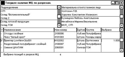 Рис 7.3. Выбор МЦ для пакетного формирования · – Принтер LowNewCity001 в количестве 1 штука. Заметим, что для принтера остаток равен три штуки. Из производства поступило 10 принтеров и 7 принтеров мы продали ООО «Колос». Закройте окно =Текущее наличие МЦ по разрезам=, нажмите кнопку [Формирование накладных], получите сообщение о формировании 2-х накладных и увидите реестр сформированных накладных. Проверьте по реестру правильность наименований и количеств МЦ. Перейдите к накладным (Документы \Накладные склад -> розничная торговля). В окне =Список накладных на передачу МЦ в розничную торговлю= выберите нужную накладную в Магазин запчастей по клавише Enter, перейдите в окно =Редактирование накладной на передачу МЦ в розничную торговлю= и подтвердите движение через кнопку [Формирование ордеров]. При активизации данной кнопки выполняется формирование расходного складского ордера и карточек учета товаров по накладной. Просмотрите карточки на экране. Признаком, что ордер и карточки сформированы, служит наличие даты в поле Перемещение проведено. Сделайте то же самое для второй накладной. Закройте окна. Date: 2015-07-10; view: 512; Нарушение авторских прав |