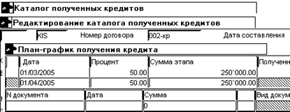 Рис 8.1. Карточка полученного кредита Если указан процент по кредиту, то нажатие в поле Сумма к возврату клавиши F3 приведет к расчету этой суммы с учетом указанного процента годовых на дату гашения. Фиксированную сумму гашения можно ввести с клавиатуры. Используя экранные кнопки можно ввести или просмотреть дополнительные данные по кредиту. Через кнопку [Получение] задайте план-график получения кредита, состоящий из двух этапов (Рис 8.2): Дата получения - 01\ТМ+1\ТГ и 01\ТМ+2\ТГ, Процент - 50 и 50. Сумма этапа вычисляется автоматически по клавише F3. Заметим, что в столбце Полученная сумма числа отсутствуют. Это значит, что кредит еще не получен. Заметим, что нижняя панель пуста. Это значит, что документы на получение кредита не оформлялись.