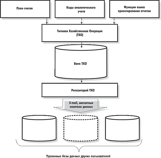 По своей сути типовая хозяйственная операция (ТХО или ТФО) — настраиваемая пользователем процедура разноски суммы хозяйственного документа по регистрам учета с учетом заданной аналитики (см. Рис. 12 "Схема настройки ТХО"). Суммы проводок рассчитываются посредством настраиваемых пользователем алгоритмов, использующих так называемые системные идентификаторы, а также функции встроенного языка проектирования расчетных форм (см. далее подраздел "Бухгалтерская отчетность"). Реализована функциональность ТХО API (application programming interface), которая дает возможность сторонним разработчикам расширять вычислительные возможности идентификаторов ТХО. Доработка осуществляется на уровне программирования VIP -интерфейсов (о языке VIP читайте в разд. 3 "Средства разработки и поддержки системы"). .