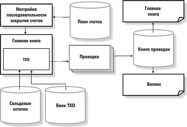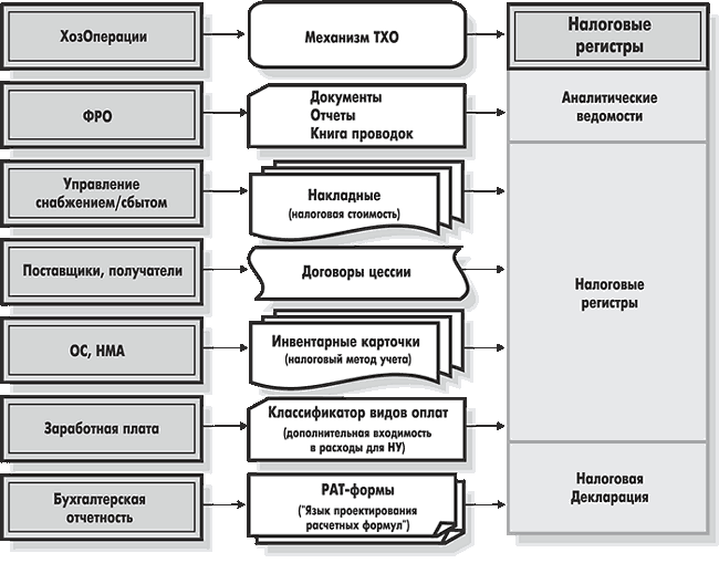 Рис. 18. Схема закрытия временных счетов В системе Галактика реализованы гибкие и универсальные механизмы для автоматизированного ведения налогового учета, позволяющие оперативно "подстраиваться" под изменяющееся законодательство. Система дает возможность раздельного ведения бухгалтерского и налогового учета, формирования налоговых регистров и налоговой отчетности в соответствии с требованиями действующего Налогового Кодекса РФ. Принцип построения налогового учета в системе базируется на однократной регистрации первичных документов, формировании учетных записей от первичного документа с использованием настроенных ТХО, использовании набора готовых отчетов и механизма настройки, а также создании пользовательских отчетных форм для расширения состава отчетов в соответствии с требованиями предприятия. Налоговая отчетность строится на данных первичных документов и сформированных по ним проводок. Для налогового учета можно использовать как параллельный план счетов, так и бухгалтерский план счетов, расширенный специально введенными для налогового учета синтетическими и аналитическими разрезами учета. Средства системы по ведению налогового учета сосредоточены не только в модуле Налоговые регистры, но и в других модулях Галактики (Рис. 19). В модуле Налоговые регистры скомпонованы основные функциональные средства по документированию налогооблагаемой базы по налогу на прибыль. Он содержит специально разработанную систему интерактивных настраиваемых отчетов для формирования налоговых регистров. Функции для формирования регистров сгруппированы по типам операций. Каждый полученный в результате регистр отражает перечень показателей, на основе которых можно осуществить исчисление налоговой базы в соответствии с правилами, предусмотренными 25 главой НК. .