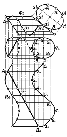 Рис.17.13. Построение развертки поверхности цилиндра способом раскатки с нанесением не ней геодезической линии а