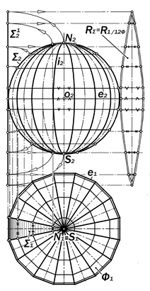 ции 8 конгруэн-тных линий пе-ресечения ци-линдрических поверхносей S с горизонталь-ными образую-щими, для кото-рых направля-ющими служат меридианы сферы как ли-нии касания S и Ф. В итоге во-круг сферы об-разуется сос-тавная поверх-ность из 16 ци-линдрических «л е п е с т - к о в», длина которых по оси равна расстоя-нию между полюсами N и S сферы. 3. По горизонтальной проекции рё-бер составной поверхности и мериди-анов между ними построить их фронта-льные проекции. Очерком фронтальной проекции Ф2 сферы Ф является окру-жность, а фронтальными проекциями промежуточных рёбер и меридианов являются эллипсы с различными отно-шениями общей для всех эллипсов большой осью к их малым осям. 4. Разделив очерк фронтальной проекции сферы на 16 равных частей, соединить попарно точки, симметрич-ные относительно оси і2, изобразив тем самым фронтальные проекции 16 -уго-льных параллелей составной поверх-ности. 5. По фронтальным проекциям па-раллелей построить их горизонтальне проекции. 6. Выделить фронтально-проециру-ющий «лепесток» S (S1 S2) и спрямить его вырожденную в полуокружность S2 фронтальную проекцию в прямую S21, длина которой равна длине полумери-диана. 7. Справа от Ф2 , на расстоянии, рав-ном половине стороны описанного во-круг экватора 16-угольника, провести вертикальную прямую, на которой, в проекционной связи с S21, провести со-вмещенные положения соответствую-щих параллелей «лепестка» S. 8. От точек пересечения паралле-лей лепестка с его осью отложить впра-во и влево расстояния, соответственно равные половинам их длин, замерен- ным на их горизонтальных проекциях. 9. Построенные точки соединить плавными кривыми линиями, симмет-ричными относительно оси. Получен-ная в итоге плоская фигура является приближенной разверткой 1/16 части поверхности сферы Ф. Её полная раз-вертка состоит из 16 таких лепестков. Date: 2015-07-10; view: 643; Нарушение авторских прав |