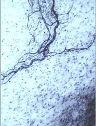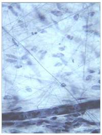 Рис. 5.1. Рыхлая неоформленная соединительная ткань. Пленочный препарат. Окр.: железным гематоксилином по Ясвоину. При малом увеличении видно, что основу препарата составляют волокна, лежащие в разных направлениях, что характерно для неоформленной соединительной ткани, между волокнами находится много аморфного вещества, что является признаком рыхлой волокнистой соединительной ткани. Выбрав участок с рыхлым расположением волокон и значительным количеством клеток – рассмотрим его под большим увеличением. Коллагеновые волокна окрашены в синий цвет, они разной толщины, волнообразно извиваются. От них резко отличаются эластические волокна – они тонкие и прямые. Из клеточных элементов легко найти фибробласты. Это крупные клетки неопределенной формы и с неясными контурами. Ядра у них крупные, овальные, светлые с мелкими гранулами хроматина и обычно с одним двумя ядрышками. При удачной окраске можно выявить различия в окраске цитоплазмы – более темную эндоплазму, окружающую ядро, и более светлую экзоплазму, расположенную по периферии цитоплазмы. Другой вид клеток – макрофаги (гистиоциты) – отличаются плотным, интенсивно окрашенным ядром, четкими контурами и слегка пенистой цитоплазмой. Реже встречаются в препарате лимфоциты, отличаются плотным круглым ядром и тоненьким ободком цитоплазмы. Прочие клетки встречаются редко. И волокна и клетки погружены в аморфное вещество, слабо заметное в виде фона препарата.