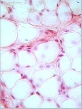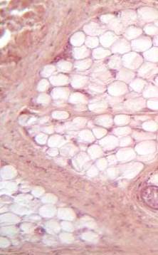 Рис. 5.3. Жировая ткань. Срез кожи головы. Окр.: Г+Э. При малом увеличении найдите жировую ткань, расположенную в глубоких частях кожи. В процессе изготовления препарата (проводка через спирты и другие органические растворители) жировые включения растворяются и на их месте остаются пустоты, указывающие, что в клетках был жир. В случае растворения больших жировых вакуолей, заполнявших почти всю цитоплазму, клетки выглядят пустыми и образуют структуру, по виду напоминающую пчелиные соты. Надо изучить строение жировой ткани при большом увеличении. Всю внутреннюю часть жировой клетки занимает пустота, оставшаяся на месте растворенного жира. Ободок цитоплазмы расширяется в области прижатого к оболочке уплощенного ядра. Некоторые клетки выглядят безъядерными, так как ядро не попало в срез. Между жировыми клетками находится рыхлая соединительная ткань с сосудами и нервными стволиками.