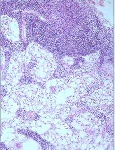 Рис. 5.4. Ретикулярная (сетчатая) ткань. Лимфатический узел.Окр.: Г+Э Лимфатический узел — кроветворный орган, в котором развиваются лимфоциты. Его строма (основа) образована ретикулярной тканью. При малом увеличении видно, что большая часть лимфатического узла занята скоплениями лимфоцитов. В центральном отделе лимфатического узла надо найти светлые пространства, почти незанятые лимфоцитами. В них видна ретикулярная ткань, которую надо изучить и зарисовать при большом увеличении Ретикулярная ткань состоит из ретикулярных клеток со слабоокрашенной цитоплазмой и из межклеточного вещества. Большая часть клеток, соединяясь отростками, образует сетчатый ретикулярный остов - синцитий). Ядра ретикулярных клеток имеют округлую или овальную форму, окрашены бледнее ядер лимфоцитов (поэтому в них видно ядрышко). В свободных участках ретикулярного синцития находятся малые лимфоциты - мелкие округлые клетки с округлым, сильноокрашенным ядром и почти незаметным ободком цитоплазмы).