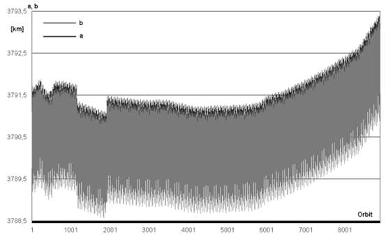 Рис. 2. График изменения большой и малой полуосей эллиптической орбиты искусственного спутника Марса MGS на протяжении первых 9000 витков полёта.