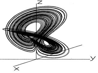 Типичным примером системы со странным аттрактором является относительно простая нелинейная электронная схема, которую в конце 1970-х годов построил японский математик Йошисуке Уэда и назвал „хаотическим маятником”. Аттрактор этой системы показан на рис. 5. Каждое колебание этого хаотического генератора уникально. Система никогда не повторяет себя, и каждый цикл открывает новую область фазового пространства. Но, несмотря на кажущуюся неустойчивость движения, точки в фазовом пространстве расположены отнюдь не беспорядочно. Они формируют сложный высокоорганизованный паттерн. Характерно, что отдельные участки траектории точки в фазовом пространстве почти повторяют друг друга, и это типично для подобных систем. Таким образом, современная наука провела грань между устойчивым хаотичным и неустойчивым беспорядочным поведением системы. Хаотичное поведение, по сегодняшним понятиям, детерминировано и образует паттерны. Странные аттракторы позволили преобразовывать эти, на первый взгляд, случайные данные в отчётливые визуальные формы. Они позволили выявить разницу между хаосом и обычной беспорядочностью или шумом.