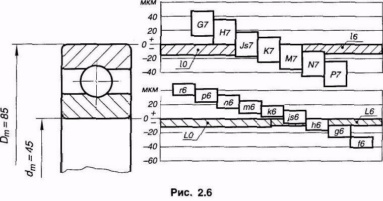 На рис. 2.6 показана схема расположения рекомендуемых полей допусков посадочных размеров для подшипников классов точности 0 и 6. Из схемы видно, что поля допусков для внутреннего и наружного колец подшипника качения расположены одинаково относительно нулевой пинии, верхнее отклонение равно 0, нижнее — отрицательное.