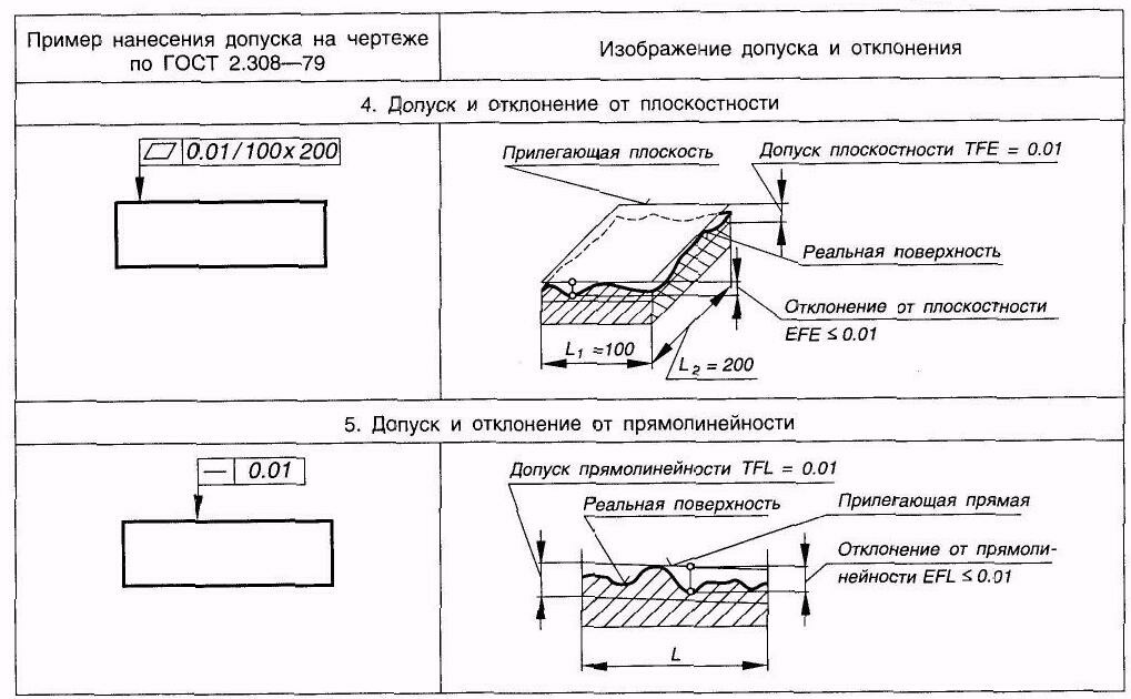 Виды допусков, их обозначение и изображение на чертежах приведены в табл. 3.1 и 3.2. Числовые значения допусков в зависимости от степени точности приведены в приложении 2. Выбор допусков зависит от конструктивных и технологических требований и, кроме того, связан с допуском размера. Поле допуска размера для сопрягаемых поверхностей ограничивает также и любые отклонения формы на длине соединения. Ни одно из отклонений формы не может превысить допуска размера. Допуски формы назначают только в тех случаях, когда они должны быть меньше допуска размера. Примеры назначения допусков формы, рекомендуемые степени точности и соответствующие им способы обработки указаны в табл. 3.3. Таблица 3.1