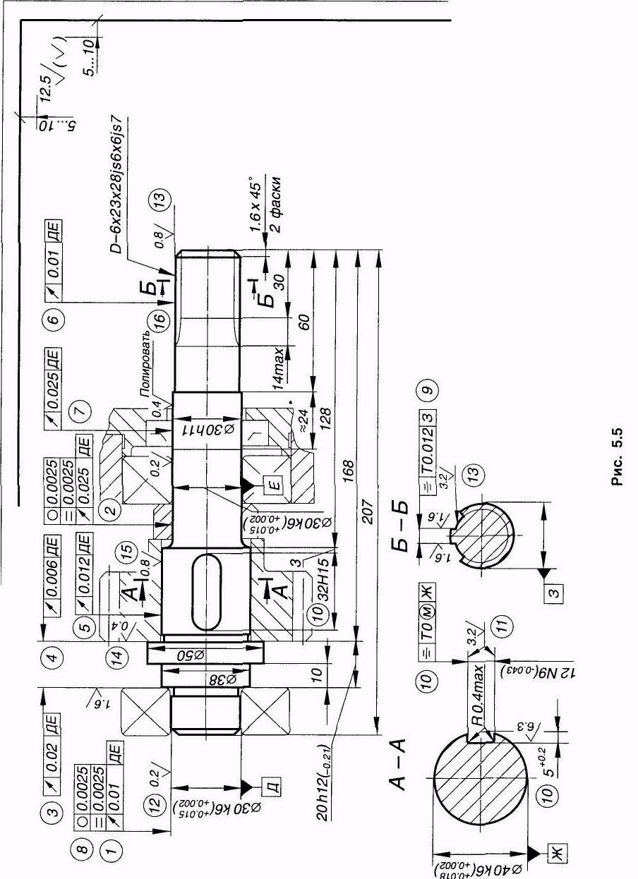 Общие требования при назначении допусков формы и расположения даны в подразделе 5.1.3, а шероховатости поверхности — в разделе 3.4. При выборе допусков формы и расположения на детали типа валов все требования можно разделить на три группы. Группа 1 связана с установкой подшипников качения — наиболее ответственных, точных и сложных изделий (назначение требований производится в соответствии с разделом 3.2) либо с созданием необходимых условий для работы подшипников скольжения (назначение требований производится в соответствии с разделом 3.3). Группа 2 — это группа требований, которые связаны с обеспечением точности зацеплений в зубчатых и червячных передачах. Группа 3 — группа требований, ограничивающих неуравновешенность деталей. При назначении допусков взаимного расположения различных элементов вала прежде всего необходимо выбрать базы, относительно которых они будут задаваться. В качестве баз следует всегда стремиться выбирать конструкторские базы, т. е. те поверхности, которые определяют положение вала в механизме. На рис. 5.5 приведена схема установки вала в механизме. Рабочей осью вала является ось, проходящая через середины посадочных поверхностей подшипников качения, которая и определяет положение вала. Поэтому в качестве базы используется общая ось двух шеек, обозначенная на рис. 5.5. буквами ДЕ.. Позиция 1. Допуск радиального биения посадочной поверхности для левого подшипника относительно общей оси. Рекомендуется назначать вместо соосности, так как контроль данного параметра осуществляется значительно проще, чем измерение соосности. Назначение технического требования — обеспечение качественной работы подшипника качения. Радиальное биение определяется с учетом суммарного допустимого угла взаимного перекоса колец подшипника (см. разд. 3.2):