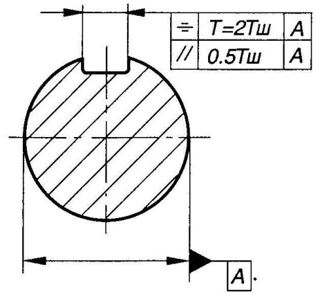 Позиция 8. Допуск формы посадочных поверхностей для подшипников качения. Допуск круглости и допуск профиля продольного сечения выбираются в соответствии с разделом 3.2. Назначение технического требования — обеспечение качественной работы подшипников качения. Отклонения от круглости и от профиля продольного сечения не должны превышать IT/4: EFK = EFP = 0.25 IT, где IT = 13 мкм — допуск размера посадочной поверхности вала. EFK = EFP = 0.25 • 13 = 3.2 мкм. Допуск формы: TFK = TFP = 2.5 мкм. Позиция 9. Допуск симметричности расположения боковых сторон шлицев. Назначение технического требования — обеспечение равномерности контакта боковых поверхностей шлицев в сопряжении. Допуск принимается по табл. 2.7 раздела 2.2. TPS = 12 мкм. Позиция 10. Допуск симметричности расположения шпоночного паза отклонения на глубину и длину шпоночного паза. В основу рекомендаций по выбору того или иного вида технических требований положены результаты анализа стандарта, устанавливающего допуски и посадки на призматические шпоночные соединения (ГОСТ 23360—78), стандартов на калибры для шпоночных соединений (ГОСТ 24109—80...ГОСТ 24121—80), а также рекомендации В. Д. Мягкова и П. Ф. Дунаева [7, 8, 10]. Рекомендации, приведенные в табл. 5.3, в равной степени относятся к шпоночным пазам, расположенным как на валах, так и в отверстиях. Таблица 5.3