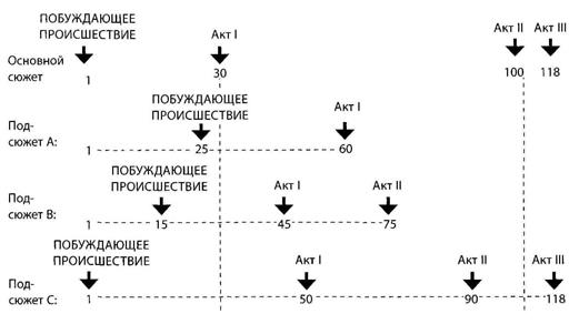 У подсюжетов своя структура акта, которая обычно имеет сжатую форму. В трехактную структуру основного сюжета можно включить три подсюжета: одноактный подсюжет А, где побуждающее происшествие происходит на двадцать пятой минуте фильма, а кульминация и концовка на шестидесятой; двухактный подсюжет В с побуждающим происшествием на пятнадцатой минуте, кульминацией первого акта на сорок пятой и концовкой второго акта на семьдесят пятой; трехактный подсюжет С, побуждающее происшествие которого помещено в рамки побуждающего происшествия основного сюжета (к примеру, влюбленные встречаются, и начинается развитие подсюжета в сцене основного сюжета, когда полицейские обнаруживают место преступления), кульминация его первого акта происходит на пятидесятой минуте, кульминация второго акта — на девяностой, а кульминация третьего акта — в рамках последней кульминации основного сюжета (влюбленные решают пожениться в той же самой сцене, где задерживается преступник).