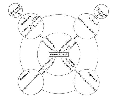 По сути, главный герой определяет состав действующих лиц. Все другие персонажи присутствуют в истории главным образом из-за отношений с ним и так или иначе помогают подчеркнуть различные измерения его сложной натуры. Положение сравнимо с солнечной системой: главный герой — солнце, роли второго плана — планеты, вращающиеся вокруг него, а эпизодические персонажи — их спутники, и все они удерживаются на своей орбите благодаря силе притяжения находящейся в центре звезды. Представим гипотетического главного героя: это забавный оптимист, который становится угрюмым и циничным; он сострадателен, потом жесток, сначала бесстрашен, а затем труслив. Такая четырехмерная роль требует, чтобы его окружали действующие лица, которые помогут показать присущие ему противоречия. Он сможет по-разному реагировать на поступки каждого из них и взаимодействовать с ними в разное время и в разных местах. Эти вспомогательные персонажи должны дополнять главного героя, чтобы сложность его характера показывалась последовательно и вызывала доверие. Например, персонаж А провоцирует проявление печали и цинизма главного героя, а персонаж Б помогает обнаружить жизнерадостную, оптимистическую сторону его характера. Персонаж В пробуждает в нем нежность и бесстрашие, в то время как персонаж Г заставляет его сначала сжаться от страха, а потом в ярости наброситься с кулаками. Создание и разработка персонажей А, Б, В и Г диктуется потребностями главного героя. Их главное предназначение заключается в том, чтобы через действия и реакции сделать понятной и достоверной сложность центральной роли фильма. Несмотря на то что персонажи второго плана должны быть менее значительными, чем главный герой, они тоже могут быть сложными. Например, двухмерный персонаж А поначалу покажется прекрасным и нежным, но ему придется принимать вынужденное решение, и тогда проявятся его безразличие и мягкотелость. Даже одно измерение способно способствовать созданию великолепной вспомогательной роли. Так, для персонажа Б может быть характерно, как в случае с Терминатором, только одно противоречие: машина и человек. Если бы Терминатор оказался просто роботом или человеком из будущего, он не вызвал бы такого интереса у зрителей. Однако в нем соединяется и то и другое, и это измерение делает его выдающимся злодеем.