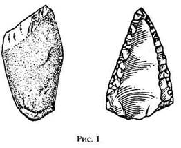 Из всех свидетельств, доказательств, собранных нами в поддержку нашей теории, доказательством номер один является сам человек. Во многих отношениях современный Homo sapiens является чужаком на Земле. С тех пор как Чарльз Дарвин потряс ученых и теологов своего времени доказательствами существования эволюции, человека было принято считать конечным звеном в длинной эволюционной цепи, начавшейся с простейших форм жизни, из которых через несколько миллиардов лет развились позвоночные, а затем млекопитающие, приматы и сам человек. Однако, добравшись до предполагаемых истоков жизни на Земле и начав размышлять о возможности существования жизни на других планетах нашей Солнечной системы и за ее пределами, ученые стали сомневаться в верности своих теорий, приходя к выводу, что Земля никак не может являться колыбелью зарождения жизни. Если жизнь возникла в результате случайных химических реакций, то почему все живые организмы на Земле развились из единого источника, а не из множества случайных источников? И почему в состав органической материи входит лишь незначительное количество распространенных химических элементов и большое число элементов, редко встречающихся на нашей планете? Быть может, жизнь была принесена на нашу планету из другого мира? Не меньшую загадку представляет собой и положение человека на эволюционной лестнице. Вначале ученые — по разрозненным останкам — сделали вывод, что человек впервые появился в Азии приблизительно 500 тысяч лет назад. Однако после изучения более древних окаменелостей выяснилось, что процесс эволюции шел гораздо медленнее. Современный исследователи полагают, что первая обезьяна, которую можно считать предком человека, появилась на Земле примерно 25 миллионов лет назад! Открытия сделанные в Восточной Африке, позволили установить, что эволюционный переход к человекообразной обезьяне (гоминиду) совершился около 14 миллионов лет назад. И лишь 11 миллионов лет спустя в том же регионе появился первый обезьяночеловек, которого без всяких оговорок можно отнести к классификации Homo. Первое существо, действительно похожее на человека, — «развитый австралопитек» — обитал в той же части африканского континента около 2 миллионов лет назад. Тем не менее потребовался еще один миллион лет эволюции, чтобы появился вид Homo erectus. Наконец, спустя еще 900 тысяч лет, появился первый примитивный человек, которого ученые назвали неандертальцем, — в честь местности, где впервые были обнаружены его останки. Несмотря на то что между появлением австралопитека и неандертальца прошло более двух миллионов лет, и тот, и другой пользовались схожими орудиями труда — заостренными камнями (рис. 1) — и внешностью (как мы их себе представляем) мало чем отличались друг от друга.