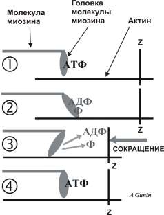 - от головки миозина, присоединенной к актину, отсоединяются АДФ и Фосфат и именно в этот момент головка миозина делает гребковое движение и молекула миозина продвигается вдоль молекулы актина (другими словами - молекула миозина тянет на себя актин)