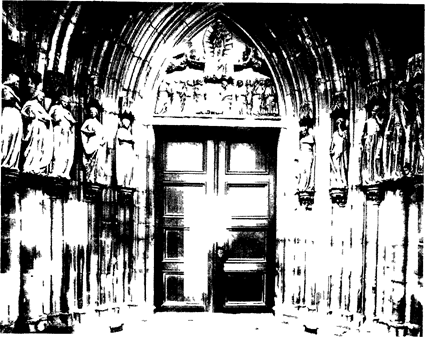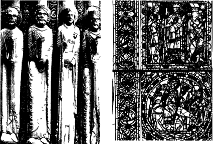 Статуи так называемого королевского портала собора в Шартре Витраж западного фасада Шартрского собора. Фрагмент