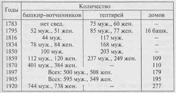 В 1895—1905 гг. в источниках национальный признак отсутствует, в 1920 г. все жители — тептяри. Однако здесь наблюдается то же самое, как было сказано о предыдущей деревне. К 1838 г. был жив ветеран Отечественной войны 1812 г. зауряд-есаул Имангул Юсупов сын Иликов, 1777 года рождения, воевавший в составе 11-го башкирского полка89. Его сыновья Абдулгарей (17 лет), Арсланга-рей (5), Саитгарей (4), Якуп (1). В 1843 г. 499 башкир засеяли 472 пуда озимого и 2328 пудов ярового хлеба. Д. Бикметово — поселение припущенников из башкир и тептярей. Время их заселения определено договором о припуске от 15 декабря 1760 г.90 В 1795 г. здесь проживали в 6 дворах 93 башкира, в 2 дворах 13 тептярей, в 1 дворе 3 татарина. В 1834 г. башкир было 239 (15 дворов), тептярей — 20 человек. В 1859 г. все правильно названы припущенниками — 509 человек (63 двора), но без определения их этнического происхождения. 602 башкира и 38 татар при 109 домах было в 1870 г., 1356 башкир при 251 дворе — в 1920 г. В 1843 г. на 229 башкир было засеяно 344 пуда озимого и 1192 пуда ярового хлеба, посажено 8 пудов картофеля. Д. Туктагулово была основана припущенниками из башкир и тептярей. Первое ее упоминание относится к 1752 г. Свое пребывание в деревне припущенники оформили с вотчинниками Кандинской волости в 1755 г.91 Через 7 лет по VII ревизии тептярей насчитывалось 40 душ м.п.*