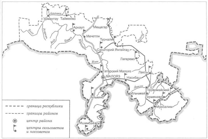 объединение, платили в казну ясак в объеме 340 куниц. Сколько вносила в этот объем ясака каждая из волостей — неизвестно. Но известна территория расселения каждой из них. Территория 12 айлинских волостей, куда входили все 6 волостей, расположенных на земле нынешнего Салаватского района, сравнительно четко определена в ясачной книге за 7181 (1673) г. Тогда подьячий Уфимской приказной избы Иван Жилин в целях сбора ясака объездил разные деревни, в т.ч. и д. Мурзалар (сегодня Мечетлино), и переписал имена башкир, которые ему говорили, что «вотчина у них вообще». И он указал межи — границы этой вотчины. «А межи той вотчине первая от Куваканской вотчины вверх по Аю реке до устья речки Тосмы и вверх по той речке до вершины и до Уралу горы подле Табынской вотчины, а подле той Уралу горы до вершины речки Кислим да подле речки Чекиль от Черлинской вотчины на речку Казугунбаши, а с той речки на речку Узеренды, а с той речки на вершину речки Арши, а с той вершины на речку Ургал и по той речки с устья и до вершины через гору Узень на речку Аргал с вершины и до устья, а от оного вверх оного реке через гору на речку Сасику, а с той речки на речку Кулгулу, а с оной на вершину речки Башану и вниз по той речке на речку Кандуширу и до Аю реки и в той де вотчине звер-ныя и рыбныя ловли и бобровыя гоны и бортные ухожъи и всякие угодья ясаку по окладу на Уфу платят по 340 куниц, а сколько по тем правам оной Мурзаларской волости известной четвертной меры принадлежит, того в них не написано»4. В реестре и описании башкирских волостей за 1730 г. указано месторасположение Айских волостей: «по Аю и за Уралом в разных местах по озерам; по Аю горы леса и поля, а за Уралом больши степи; и от Уфинской стороны тележный путь до Уралу самой нужной, а по за Уралом с Сибирской стороны свободный путь»5. И, наконец, в 1803 г. завершилось межевание земель в Мурзаларской волости, по итогам которого в ней оказалось 185479 десятин земли, в т.ч. 3685 десятин неудобной6. Из всего количества земли под пашней находилось 5970, под сенокосными угодьями — 4063, под лесом — 159497, под степью — 12082 десятин. Вся эта вотчина находилась в руках 674 башкир-вотчинников (по VII ревизии 1816 г.), которыми были припущены 464 души м.п. из тептярей и новокрещеной мордвы7. По закону о земле 1832 г. вотчинникам в количестве 1153 душ м.п. (по VIII ревизии 1834 г.) из расчета по 40 десятин на душу полагалось всего 46120 десятин земли, припущенникам: тептярям на 298 душ по 30 десятин на душу — 8940 десятин, государственным крестьянам на 203 души по 15 десятин на душу — 3045 десятин. Для всех сословий отводилось 58105 десятин, оставалось свободной 123688 десятин волостной земли, не считая 3686 десятин неудобных угодий8. Интересно отметить, что из 127 башкир-челобитчиков под документом свои тамги поставил 91, в т.ч. 83 рядовых, 8 юртовых есаулов, подписались на тюрки 36, в т.ч. 16 рядовых, мулла, походный старшина, 2 хорунжих, 2 пятидесятника, 8 сотников. Исходя из этих сведений можно констатировать, что треть мурзаларцев-челобит-чиков умела читать и писать на тюрки (на арабской графике). Башкиры-вотчинники Мурзаларской волости практиковали припуск людей на свои земли. Так, в 1713 г. Еман Бебаев, Урусла Багарин, Боскун Акбурин с одно-вотчинниками припустили башкира Таныпской волости муллу Чурагула Тойгильдина за 49 руб. навечно на часть своей вотчины по р. Юрюзань и другим рекам, отданную еще его деду Ишке