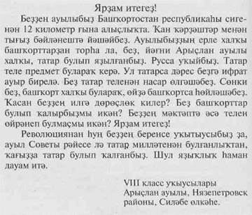 10. Файзулла Сайфуллин 30 лет. 11. Ташбулат Уразметов 65 лет, дети Абдулхаир 23, Абдулкагир 20 лет. 12. Абдулхалил Ташбулатов 28 лет, сыновья Абдулзапар 5, Мухаметсафый 1 года. 13. Гайбар Гуламсаров 34, сыновья Мухамадей 7, Муха-мадгали 5 лет. 14. Абдурашит Бурангулов 40 лет, умер в 1817 г. 15. Абзялил Абузаров 41 года, умер, сыновья Абдулфаиз 26 (сын Абдулвагап 3), Абдулнасир 19, Фаткулла 17, Тух-ватулла 14 лет. 16. Газит Абузаров 36 лет, сыновья Абдулнафик 8, Багда-сар 5 лет. 17. Абдуллатып Абузаров 32 лет, сын Абдулзалил 5 лет. 18. Азигул Туйгин 81 года, умер в 1825 г. 19. Гали Кусакбаев 51 года, умер в 1833 г., сыновья Наси-булла 15 лет, принял христианскую веру в 1821 г., Калимулла 15, Тухватулла 6 лет. 20. Аит Байзигитов 45 лет, умер в 1825 г., сын Незамит-дин 25 (сын Исламитдин 1 года). 21. Евбатыр Уразаев 65 лет, сыновья Юсуп 25, Йльяс 20, Баймухамет 19 (сын Ибрагим 1 года). 22. Юлай Уразаев 37 лет, умер в 1830 г., сын Калимулла 25 лет. 23. Батырша Уразаев 34 лет, умер в 1820 г. Сайфун Уразаев 34 лет. 24. Бабти Уразаев 42 лет, умер в 1817 г. 25. Альбида Рахматов 65 лет, сын Абульхасан 22 лет, умер. 26. Аблай Рахматов 63 лет, сын Абдулкабар 14 лет. 27. Касим Рахматов 53 лет, сыновья Сесенбай 24 (сын Зиянбай 1), Мавлютбай 22 лет. 28. Майдакай Рахматов 78, сын Мухамадала 36 (сын Ден-мухамат 12 лет). 29. Мухаметшарип Мандакаев 25 лет, умер в 1822 г., сыновья Хисматулла 25, Мухаметжан 11 лет. 30. Абзалил Коручев 30 лет, умер в 1823 г. Абдуликсан Коручев 38 лет, сыновья Давлатша 9, Ахмадей 2 лет. 31. Алпаут Абзегитов 40 лет. 32. Салим Байзигитов 60 лет, умер в 1832 г., сыновья Абдулманаф 22, принял христианскую веру в 1825 г., Абдулнасыр 36 лет. 33. Абдулгазиз Салямов 26 лет, сыновья Абдулгалим 15, Абдулкарим 12, Абдуразак 7 лет. 34. Туйбин Тойгильдин 68, сын Койын 36 (сын Мухамет-шафикЮлет). 35. Куитшан Туйбаков 32 лет. 36. Сайфутдин Сафиев 26 лет, умер в 1823 г., брат Наз-митдин 23 лет. 37. Шукур Сапаров 54 лет, умер, сын Аулия 40 (сын Афлатун 8 лет). СВЕРДЛОВСКАЯ ОБЛАСТЬ 38. 39. Мутай Султанбеков 20 лет, в 1818 г. сослан в Сибирь. Сахир Султанбеков 38 лет, сын Сафаргали 19 лет. 40. Салик Байтин 60 лет, умер в 1829 г. 41. Сафаргали Юнусов 59 лет, сын Губайдулла 22 лет. 42. Нигматулла Сафаргалин 26 лет. 43. Юнус Уразметов, сын Шагинияз 26 лет. 44. Муллагил Кузаев 59 лет, сын Казбулат 36 (сын Мурат-дин 5 лет), г 45. Асмандияр Муллаголов 34 лет (сын Асфаган 6 месяцев). Зайнибашар Муллаголов 30 лет. 46. Юлдашбай Муллаголов 38 лет. Всего в д. Озерки м.п. 103, женского — 124 души. ЦГИА РБ. Ф. И-138. On. 2. Д. 570. Л. 42-50. В 1834 г. прихожане имели мечети в дд. Шокурово, Уфа-Шигири, Арти-Шигири, Бит(ш)ково, Биткино, Рах-мангулово, Бахметево, Гайны, Азигулово, Еманзелга, Озерки, Сызги. К Красноуфимскому уезду относились дд. Арсланово и Юлдашево (Старое и Новое), находящиеся сегодня в Нязепетровском районе Челябинской волости. Д. Арсланово при р. Уфа находится в 12 км от Белока-тайского района Башкортостана и примерно на таком же расстоянии от границы Свердловской области. В 1834 г. в 45 дворах проживало 120 мужчин и 124 женщины. Жители показаны тептярями. В 1859 г. в 63 дворах было 189 мужчин и 192 женщины. Жители названы припущен-никами. В ведомости, составленной исправляющим должность тептярского старшины Зюмадиловым, от 15 ноября 1840 г. видно, что тептяри из татар заселились до 1765 г., причем там имеется любопытнейшая запись следующего содержания: «По первобытному их состоянию в башкирском сословии в Упейской волости имеют грамоту от великих государей и великих князей Иоанна и Петра Алексеевичей» от сентября 1695 г.39 Вых