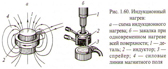 Позволяет получить высокую твердость поверхностного слоя (0,8…1,3 мм) при вязкой сердцевине детали. Деталь помещают в индуктор по которому пропускают ток BЧ, при этом в детали возникают вихревые токи, нагревающие её поверхностный слой. Продолжительность нагрева – от долей секунды до нескольких секунд. Затем деталь помещают в закалочную среду.