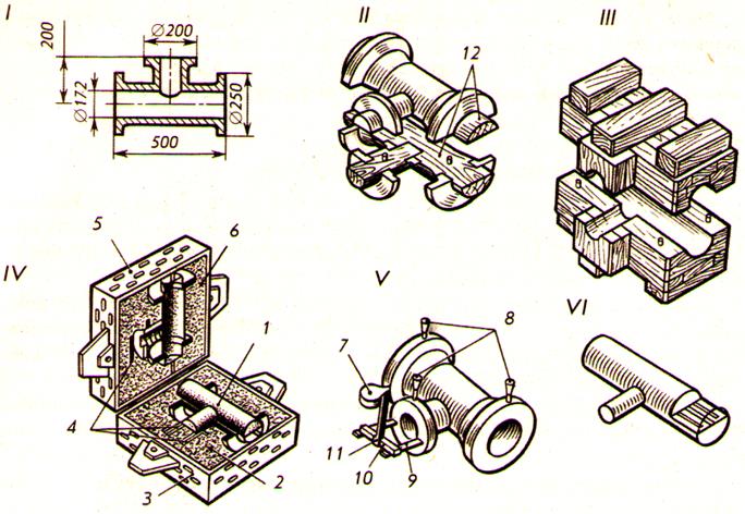 в) вынимают колышки, разъединяют опоки и осторожно вынимают половинки моделей. Литники соединяют с полостью формы, прорезая литниковые ходы;